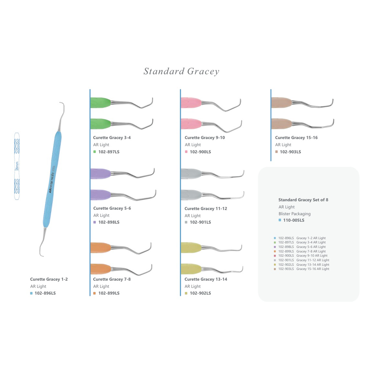 - Standard Gracey 8mm tenká, ľahká matná rukoväť pre lepší úchop a kontrolu nástroja